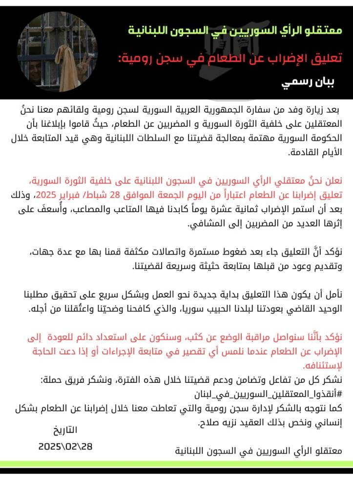 خلال الأسابيع الماضية، دخل عددٌ من معتقلي الرّأي السّوريّين في السّجون اللّبنانيّة، وتحديدًا في سجن روميّة، في إضرابٍ مفتوحٍ عن الطّعام دام ثمانية عشر يومًا. جاء هذا التحرّك احتجاجًا على ما اعتبروه “مماطلةً” و”غيابًا للحلول الجذريّة” لملفّهم، وانقطاع الأفق بشأن تسويةٍ تسمح لهم بالعودة إلى ديارهم. وقد أعلن المعتقلون تعليق إضرابهم عقب زيارةٍ رسميّةٍ قام بها وفدٌ من سفارة الجمهورية العربية السّوريّة إلى سجن روميّة، التقى خلالها عددًا من السّجناء المضربين، وأبلغهم بأنّ الحكومة السّوريّة تتابع مع الجهات اللّبنانيّة المعنيّة سبل معالجة ملفّهم.