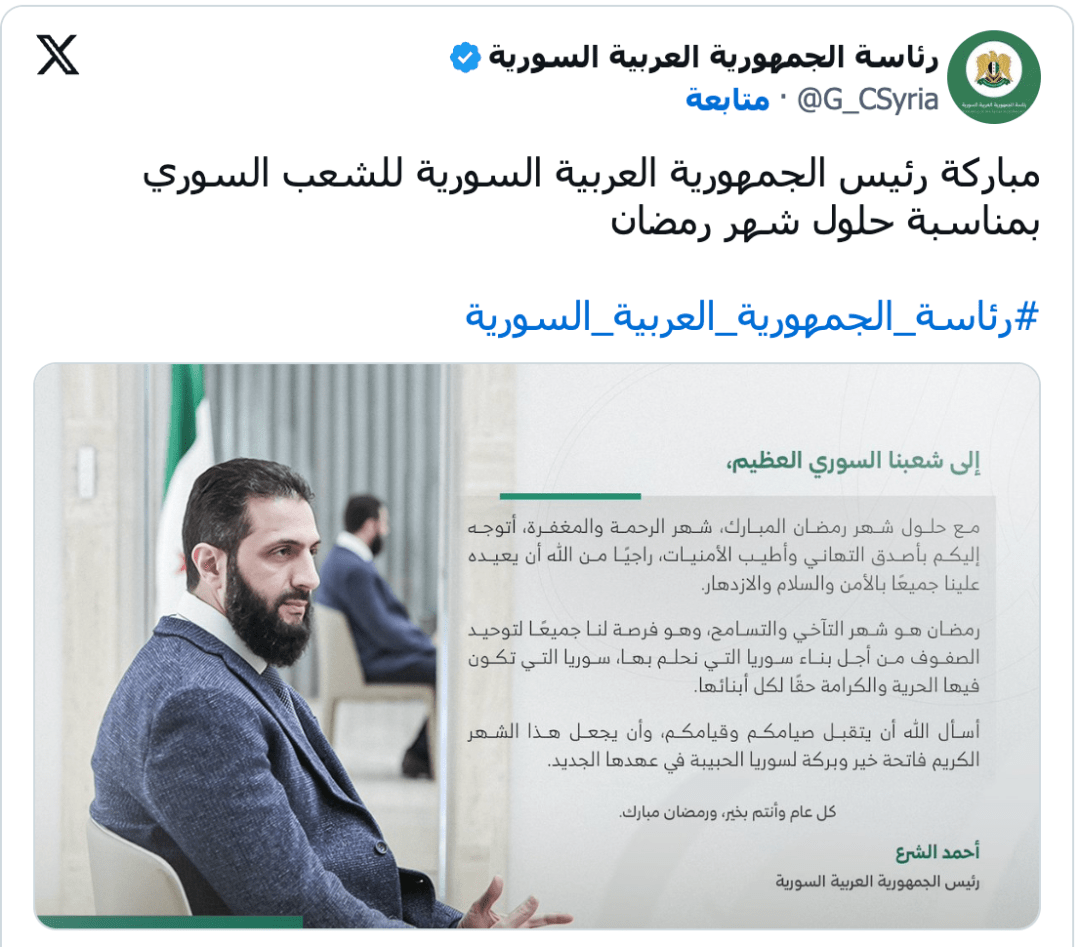 وجّه رئيس الجمهورية أحمد الشرع تهنئة ومباركة للشعب السوري بمناسبة حلول شهر رمضان المبارك، داعياً أن يكون الشهر الكريم "فاتحة خير لسوريا في عهدها الجديد".