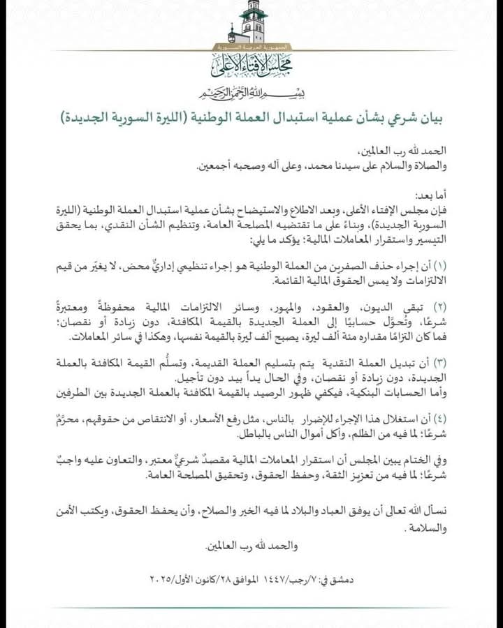 أصدر مجلس الإفتاء الأعلى في سوريا بياناً شرعياً بشأن عملية استبدال العملة الوطنية أكد فيه أن حذف الصفرين من العملة إجراء تنظيمي إداري لا يمس الحقوق المالية أو الالتزامات القائمة.